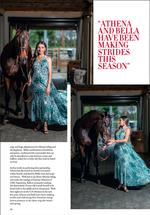 As they work on perfecting their partnership, Athena has discovered an entirely new power within herself, unlocked by Bella’s trust and scope over fences. With lots to say about Athena’s riding, and under the tutelage of Antonio Martinez of AMG Equestrian, Bella is constantly teaching this determined 18-year-old to push herself to be better both in the saddle and on the ground. With their sights set on the U25 divisions in the next few years, Athena and Bella have been making strides and embracing their feminine energy driven presence in the show ring this winter and spring.